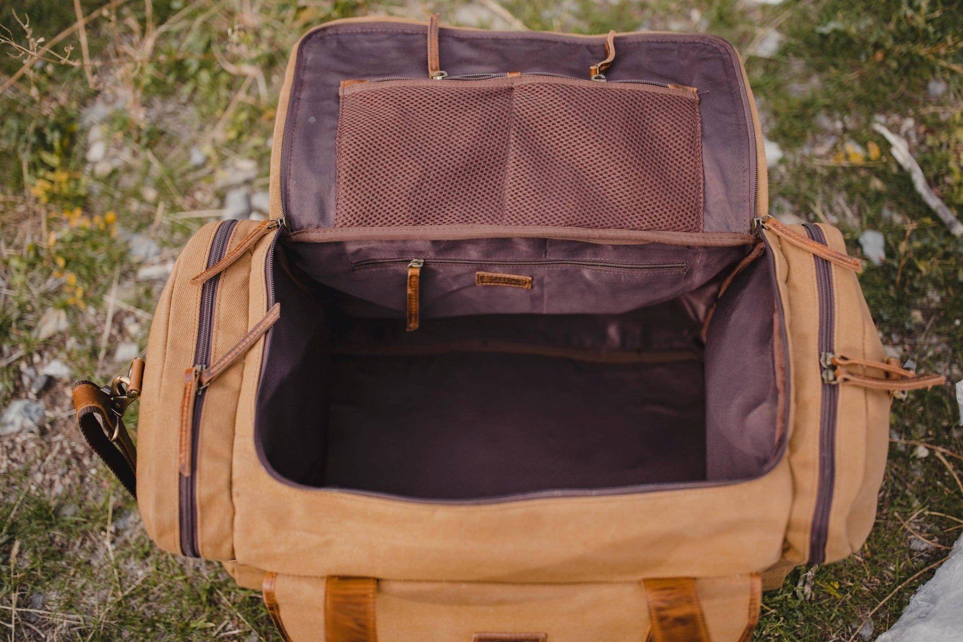 Our 55L Wasatch Duffel is the canvas weekender you've been looking for. Built with a heavy duty 18 oz. waxed canvas and full-grain leather, this bag will take anything you throw at it.