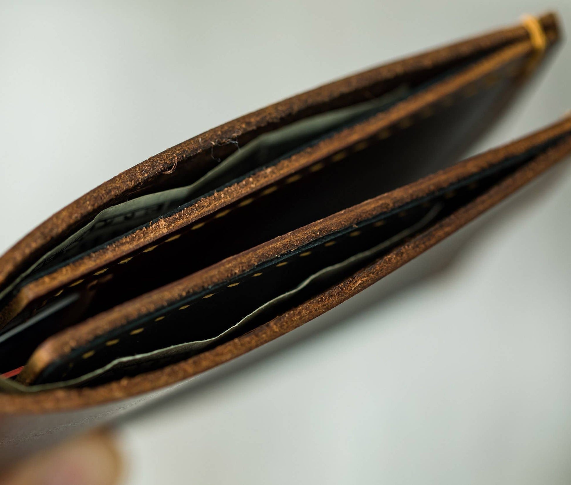 The Bi-Fold Wallet is our beautifully crafted take on the traditional bi-fold wallet. The Rivet Wallet holds all the cards you'll ever need and your bills in the traditional center pocket, all without sacrificing comfort or style. This wallet, like all of our products, is carefully hand cut and sewn with premium full grain leather.