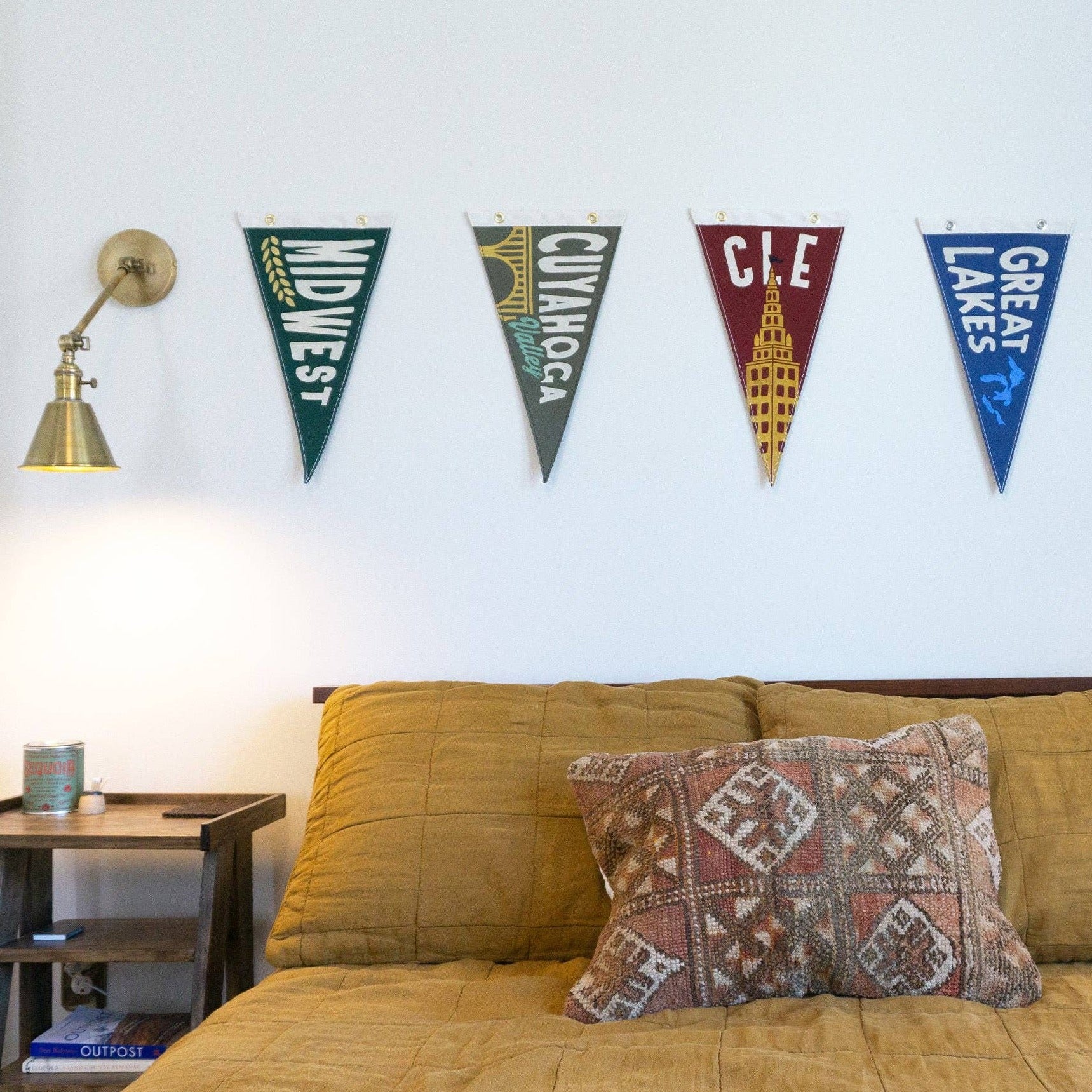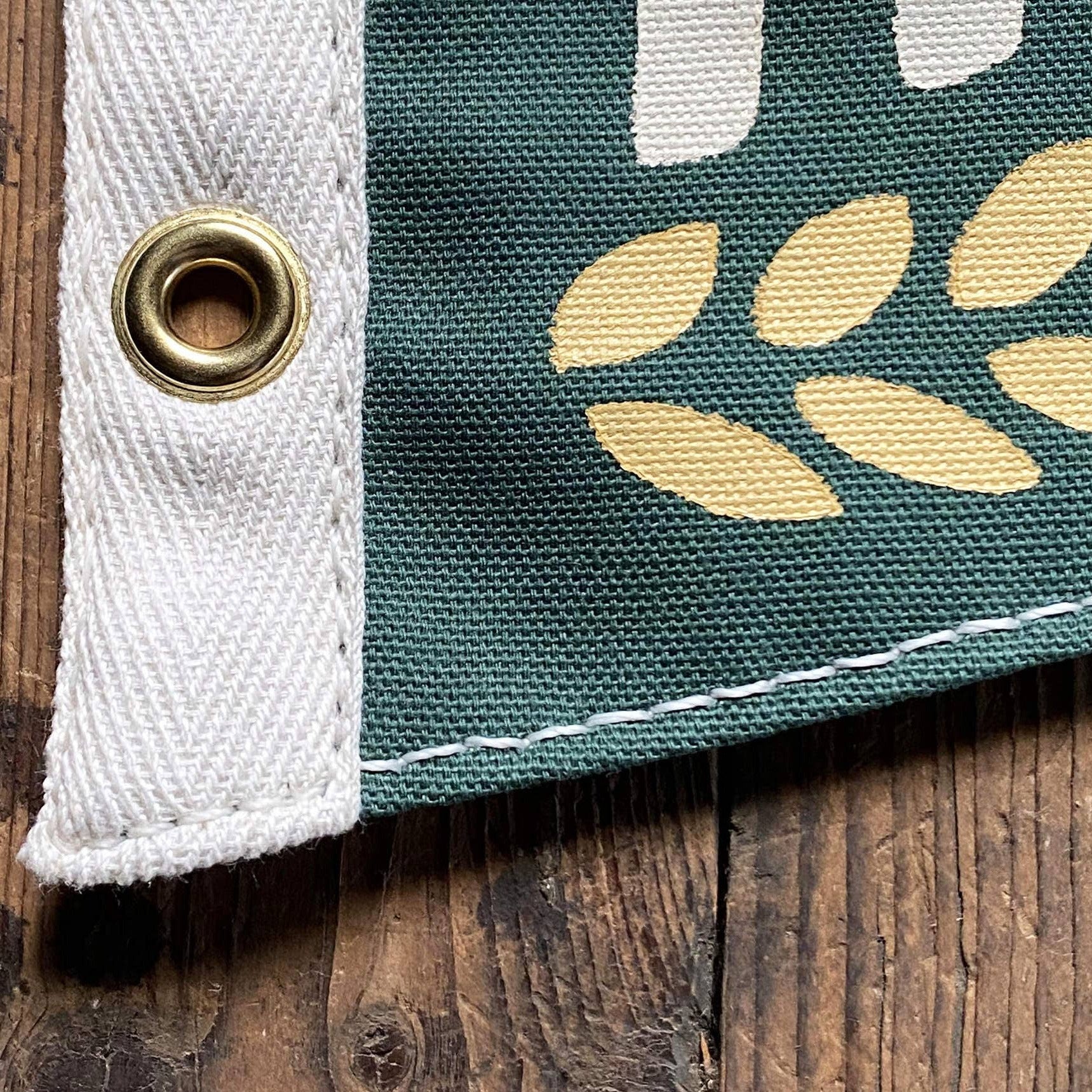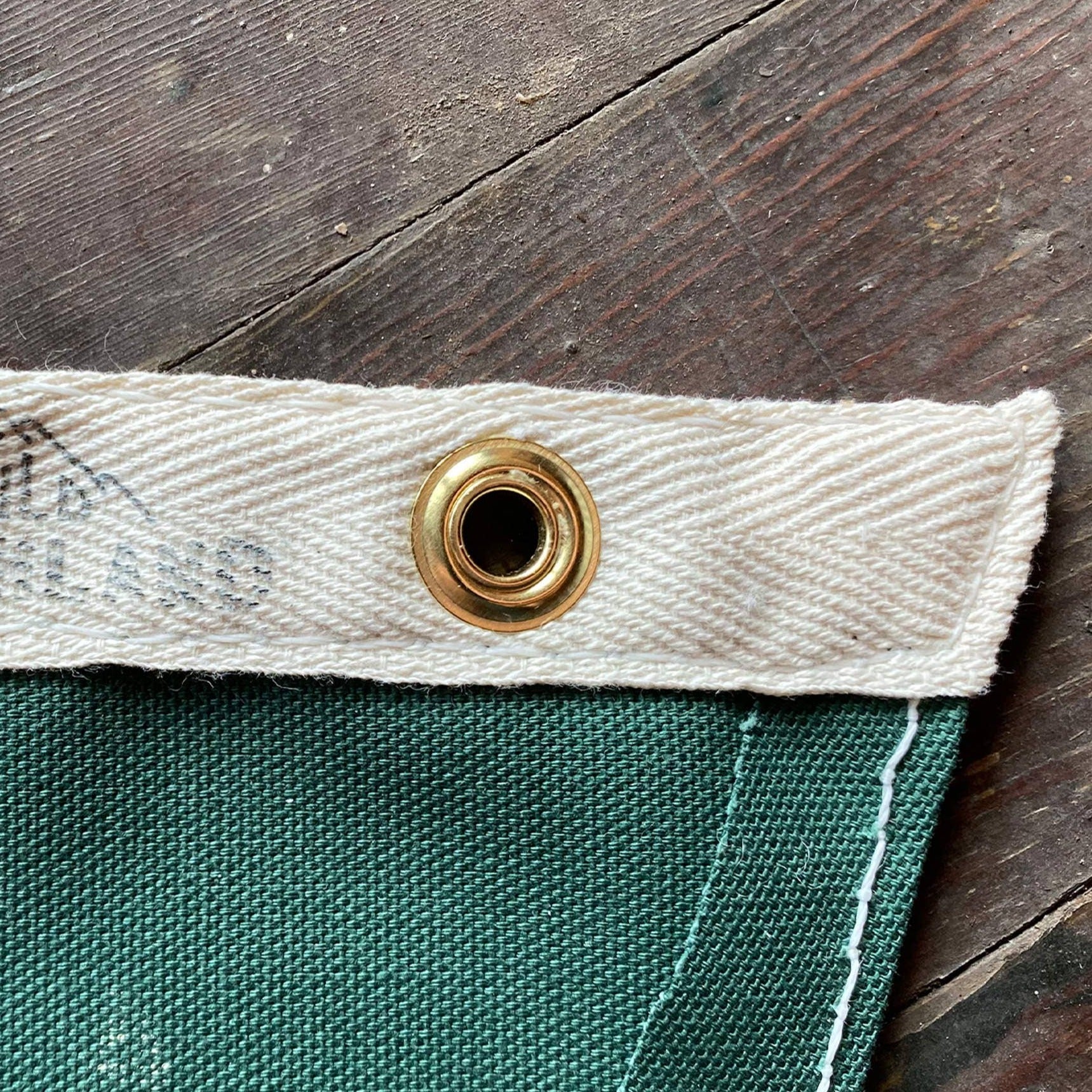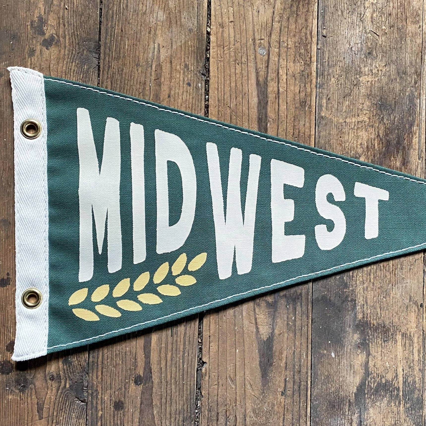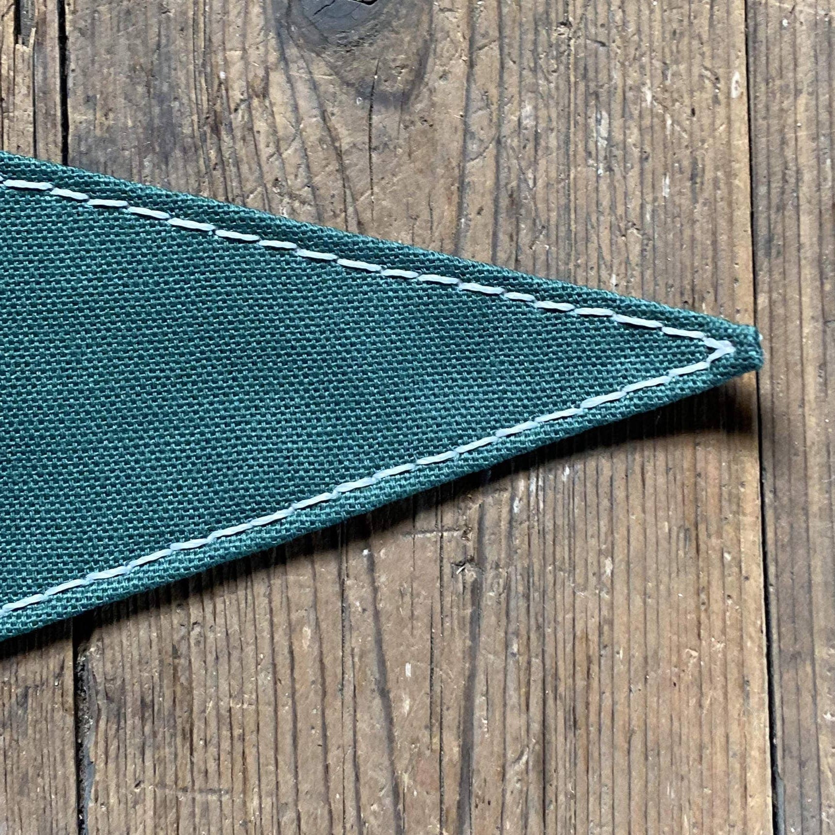 This hand-made Midwest pennant uses forest green duck canvas with a beige and ochre yellow acrylic print. Materials: Each flag is hand-sewn with waxed polyester thread, twill tape, solid brass grommets, and stamped with Wild Northland branding. Keep in mind, every pennant is unique—slight imperfections truly make each creation one-of-a-kind. Size: give or take, 18" x 9".