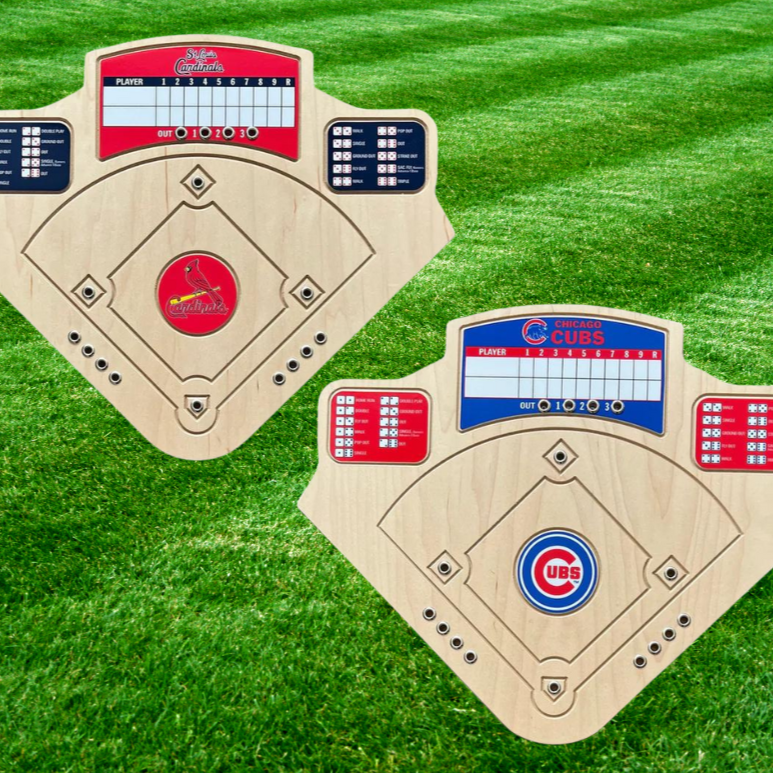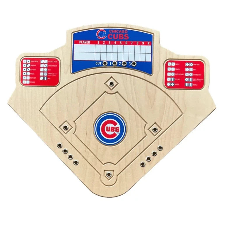 Cards or Cubs! Hit a homerun with our handcrafted baseball game! Play ball! Move the first batter to home plate and roll the dice. Use the dice combination to determine the outcome of the at-bat and move accordingly. The dry erase scoreboard allows for quick and easy changes to team names and scores. This game is crafted from high quality materials. The unique baseball diamond shaped playing surface is constructed with a maple wood veneer. Includes a pair of dice, dry erase marker, five chrome pegs, four brass pegs and directions.