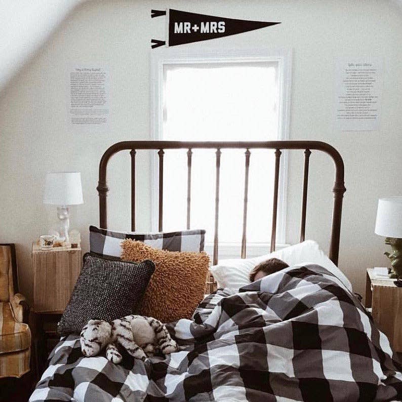Celebrate the life, love and happiness of the newly married couple with this custom Mr + Mrs wedding pennant. Perfect in photographs and great for gifts. Get this pennant framed!