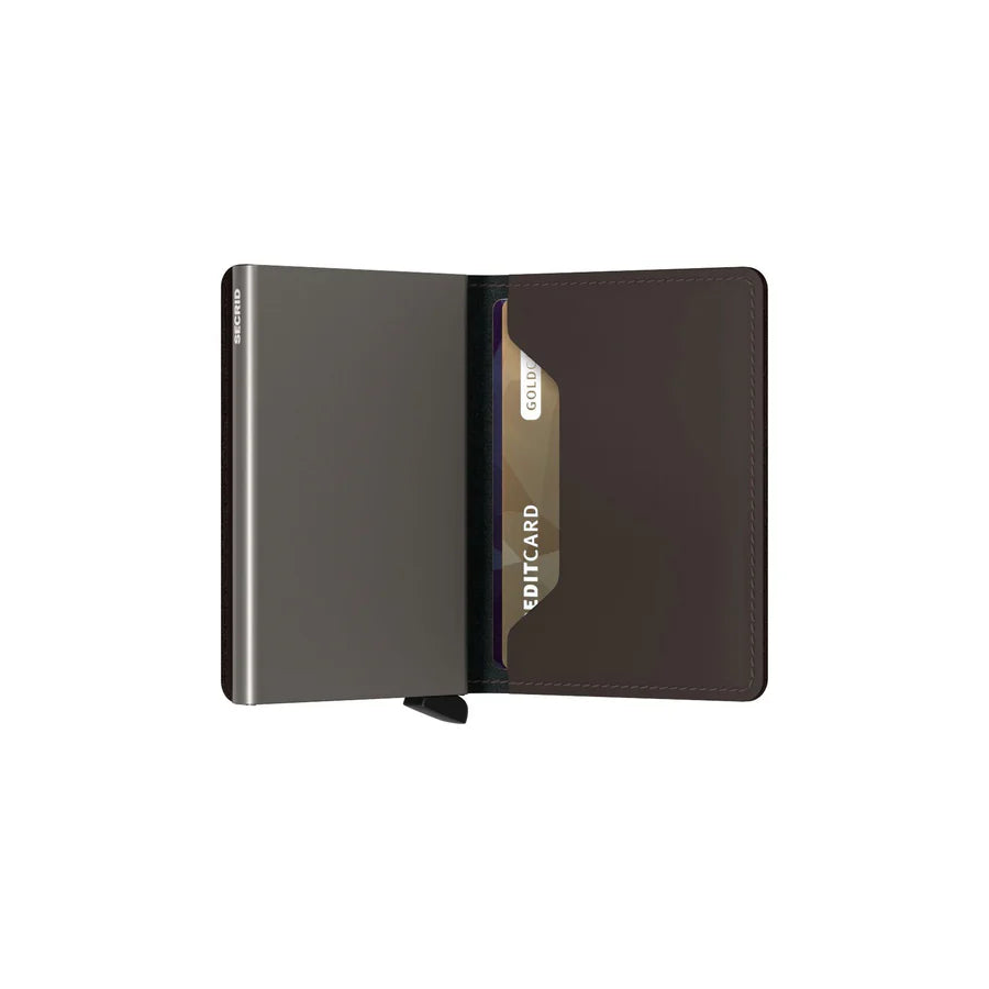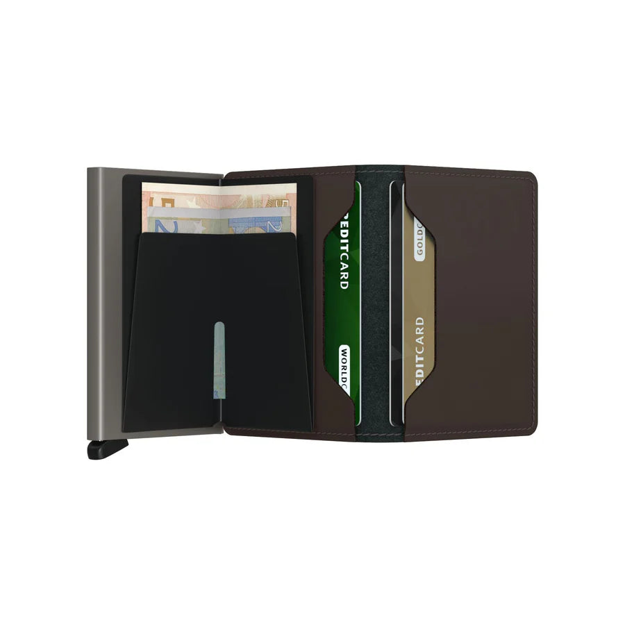 Its slim profile allows the Slimwallet to fit perfectly into any pocket. The open exterior is designed extra wide to accommodate cards, banknotes and receipts. The Cardprotector mechanism enables you to slide out cards with a simple motion, while the aluminium construction protects your cards from bending, breaking and unwanted wireless communication. A maximum of 4 embossed or 6 flat plastic cards. Up to 6 extra cards in the exterior wrap.