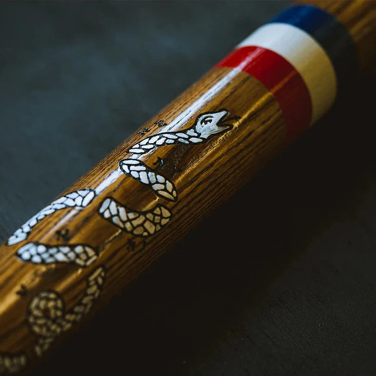 The "Join or Die" baseball bat is wood-burned or 'tatoo'd' with the segmented snake first introduced by Benjamin Franklin(yes that Benjamin Franklin) and then painted. This illustration has served in many rallying cries for unity and freedom over the centuries and is a central part of American lore.