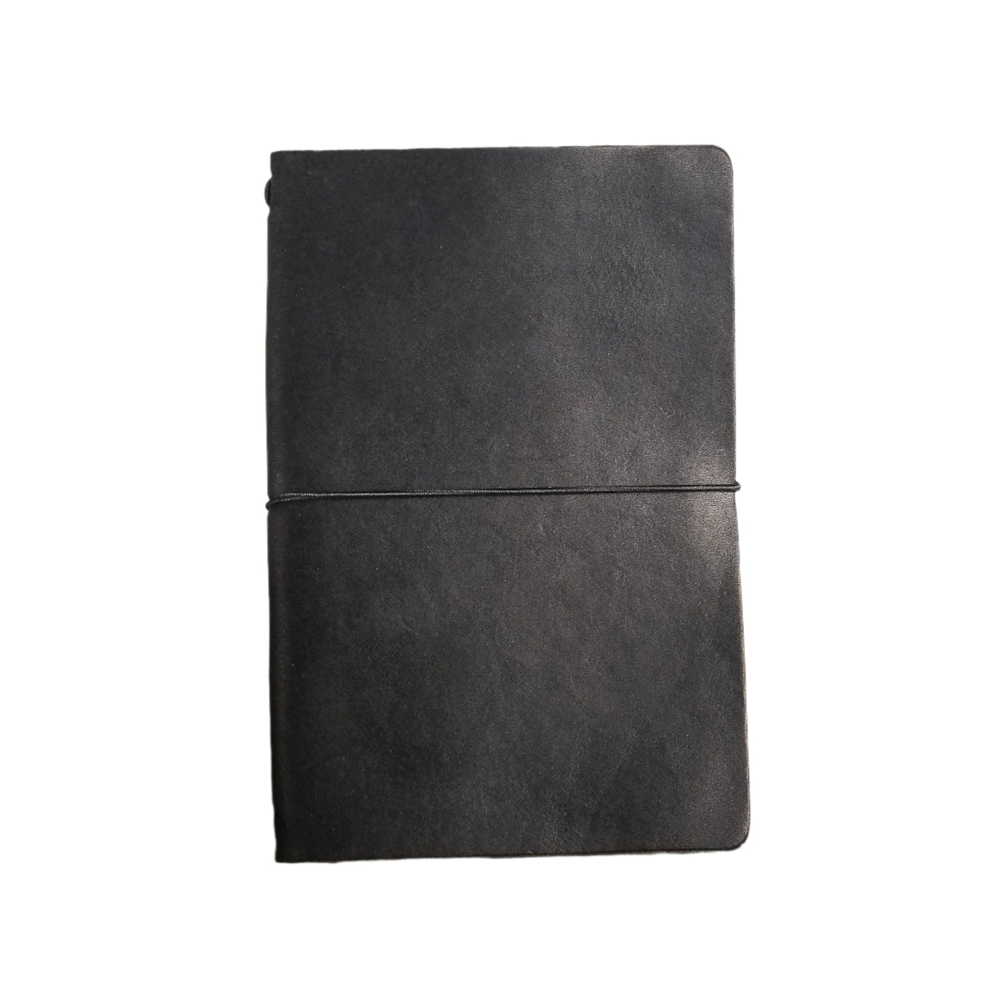 Simple and elegant, this leather traveler's notebook features Horween English Tan Dublin leather and simple elastic closure. The leather is durable enough to last a lifetime and can be easily refilled as notebooks are used. Whether you sketch, bullet journal, or just keep your grocery list handy, do it with style. Each notebook cover includes one 3.5" x 5.5" plain memo book. Black